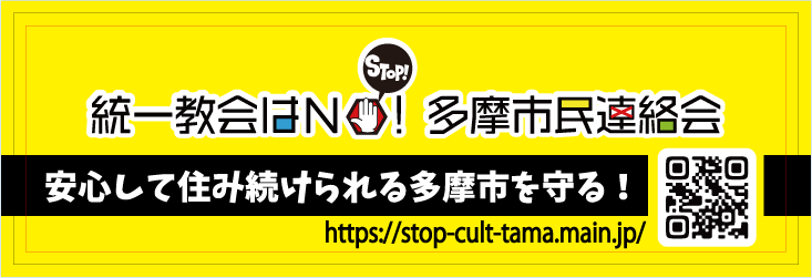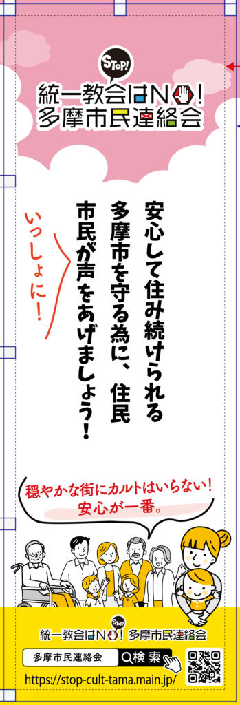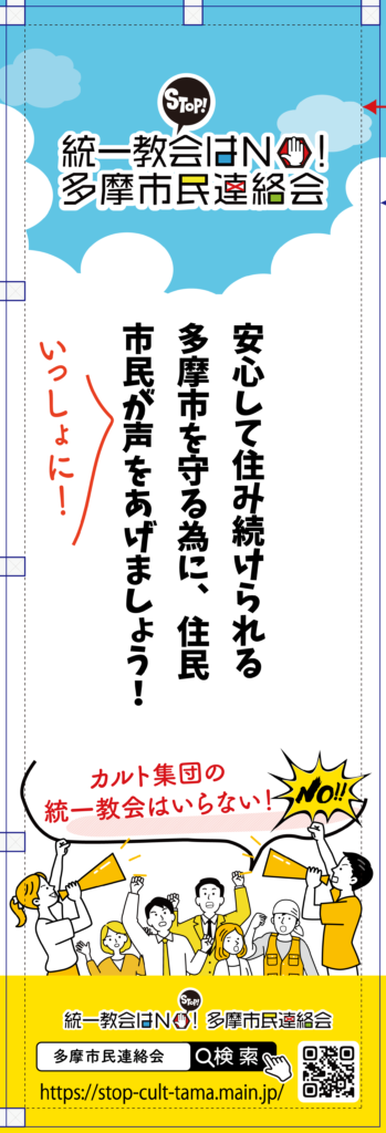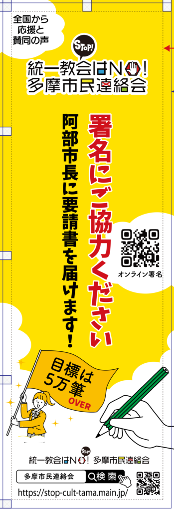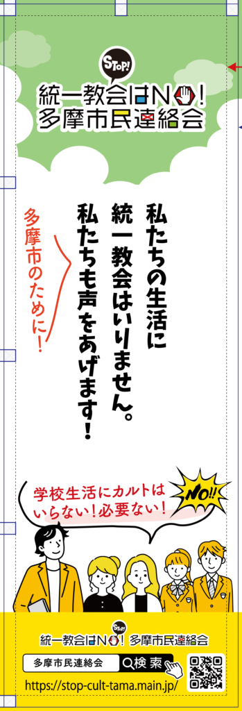統一教会はNO!多摩市民連絡会では、市民の皆さんに署名をお願いしたり、問題解決のためのイベント開催時のために横断幕とのぼりを作成しました。