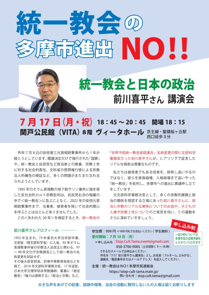 私たちは被害者でもある信者を排除し追いやるのではなく、彼らを家族崩壊、人格崩壊まで追いやった「統一教会」を批判し、多摩市への進出に異議申し立てをしています。元文部科学事務次官として、多くの宗教的課題と政治の関係を現認する立場にあった前川喜平さんに、政治と宗教のリアルな関係についてのお話や、子どもの人権や宗教2世についてのご意見を伺い、この運動をさらに深めていきましょう。
